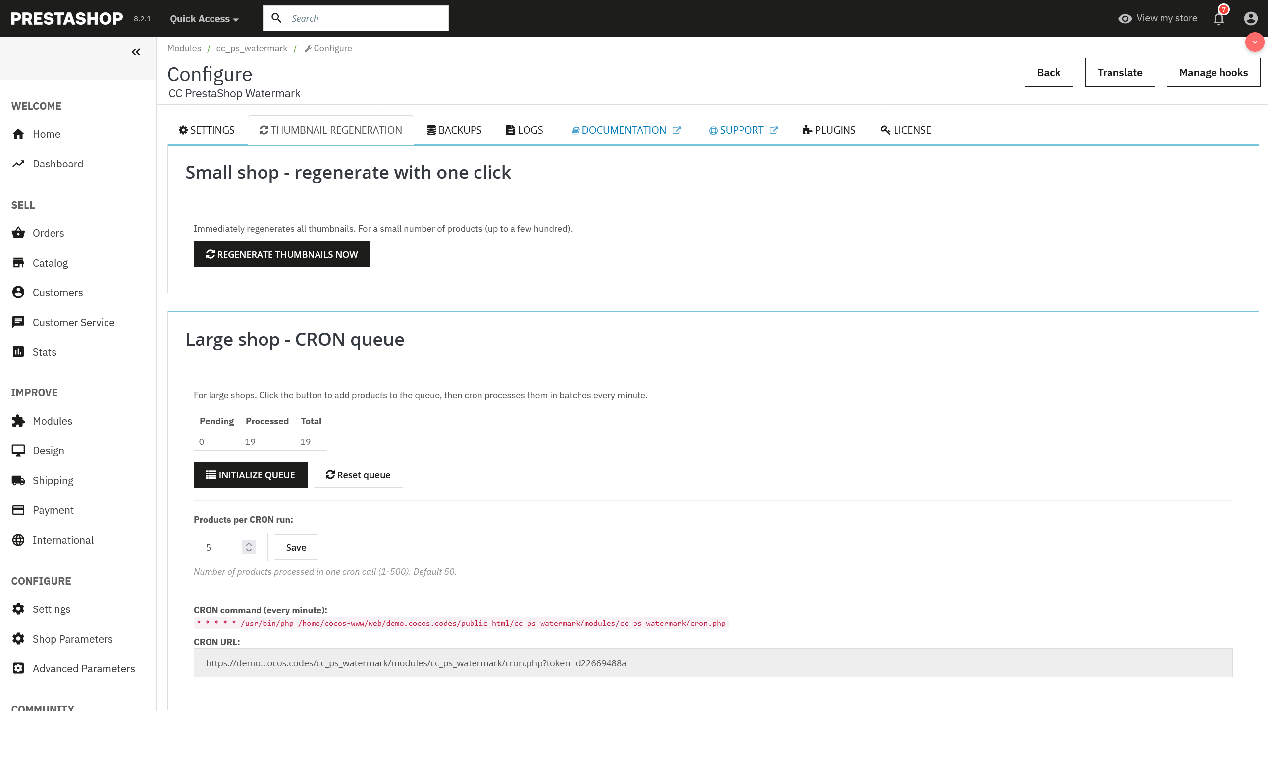 Protect your product images from theft and unauthorized use! CC PrestaShop Watermark This is an advanced module that automatically adds watermarks to all product thumbnails in your store. Regardless of catalog size or server capabilities, the system processing queues CRON enables seamless tagging of any number of photos on any server. Utilize an intelligent backup system, automatic regeneration, and full process control to safeguard your images without the risk of losing original versions.