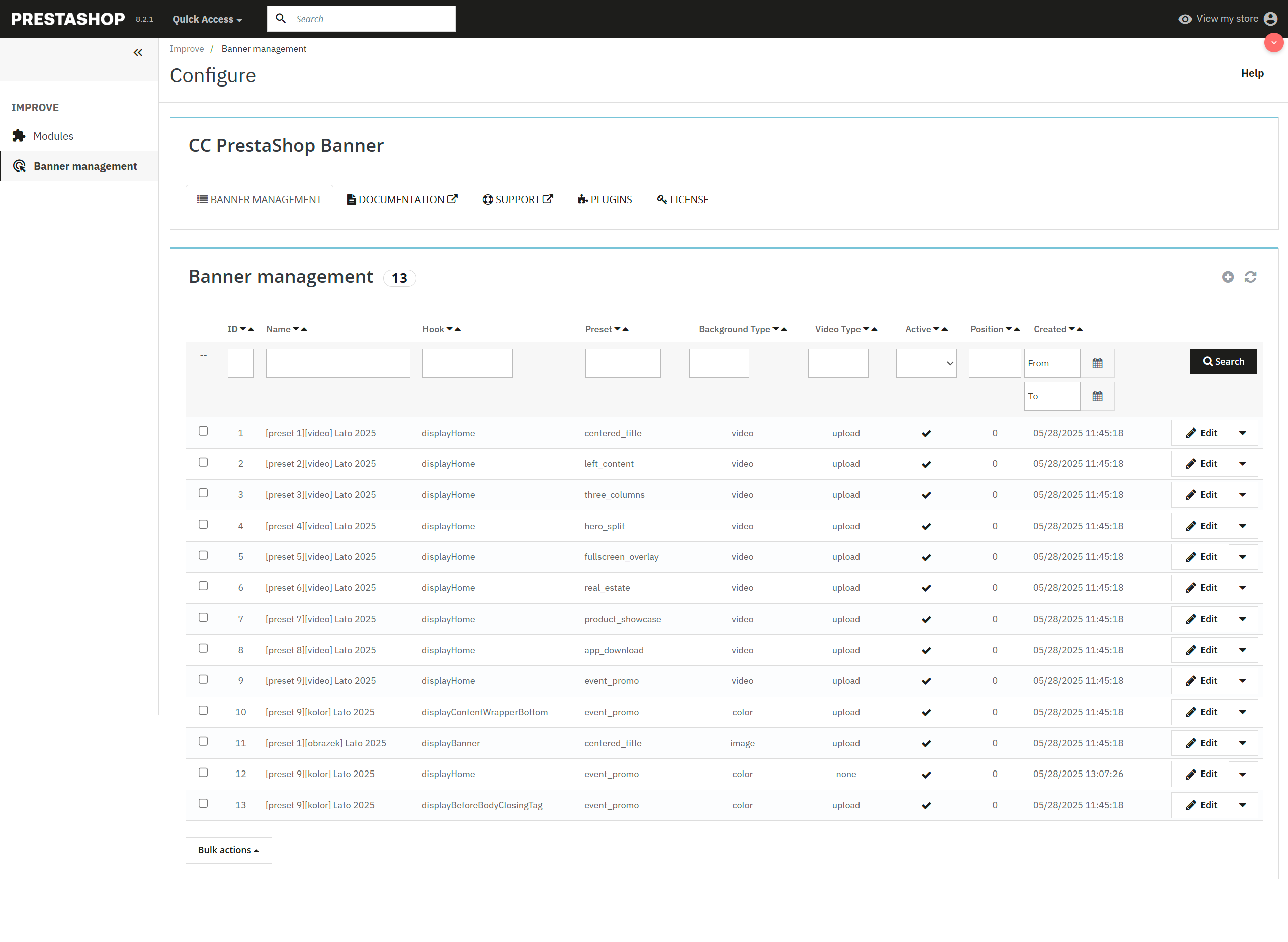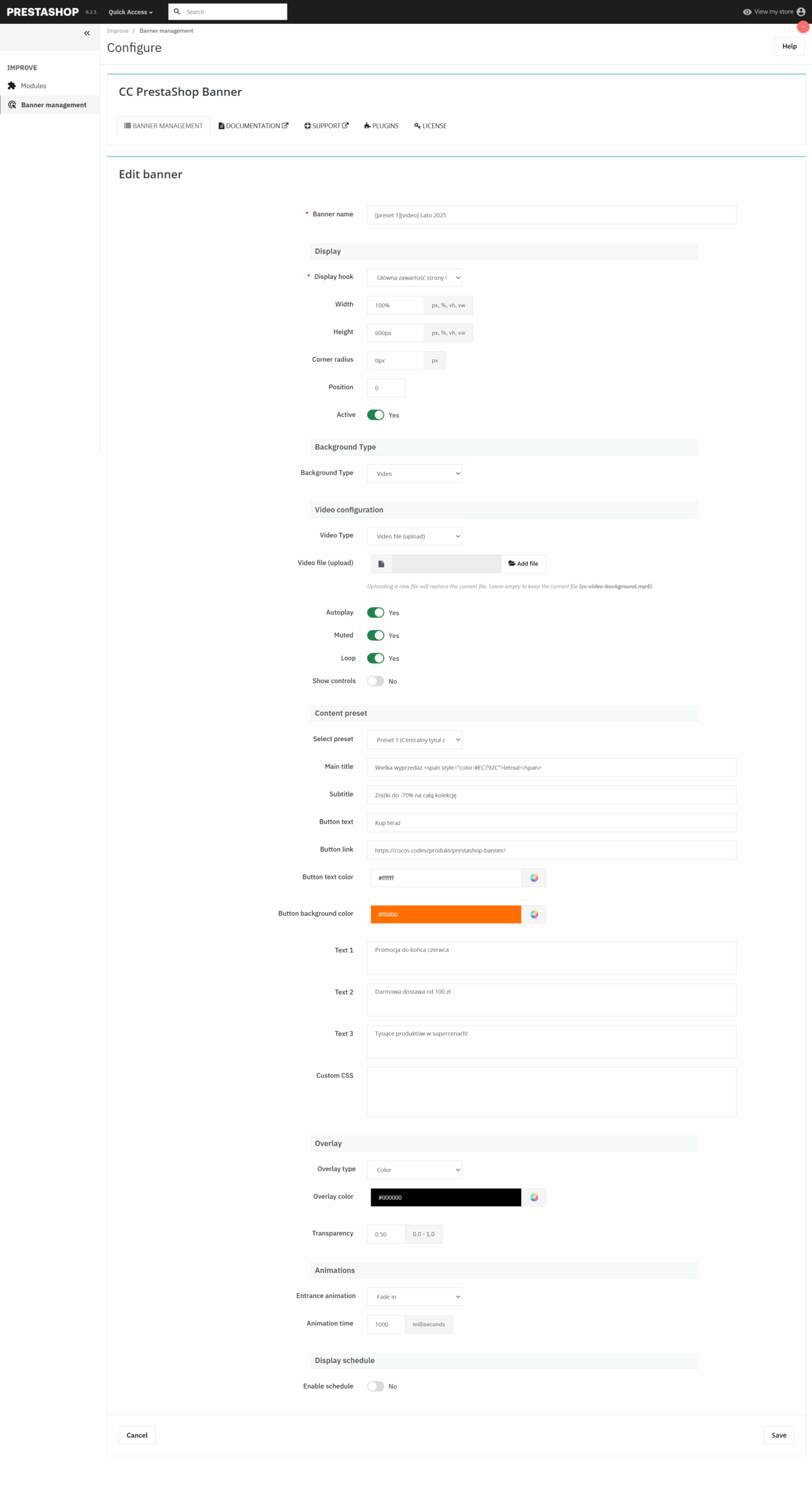 Aumente la eficacia de las promociones de su tienda con llamativos banners. CC PrestaShop Banner es un módulo intuitivo que le permite crear atractivos banners con animaciones, fondos de vídeo y plantillas ya preparadas, sin necesidad de codificación. Adapta fácilmente el aspecto a tu tienda, atrae la atención de los clientes y mejora los resultados de ventas.