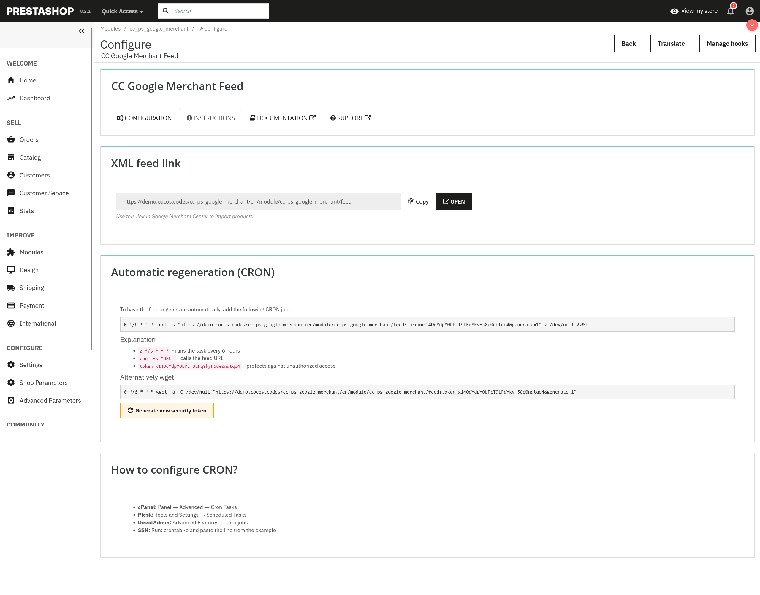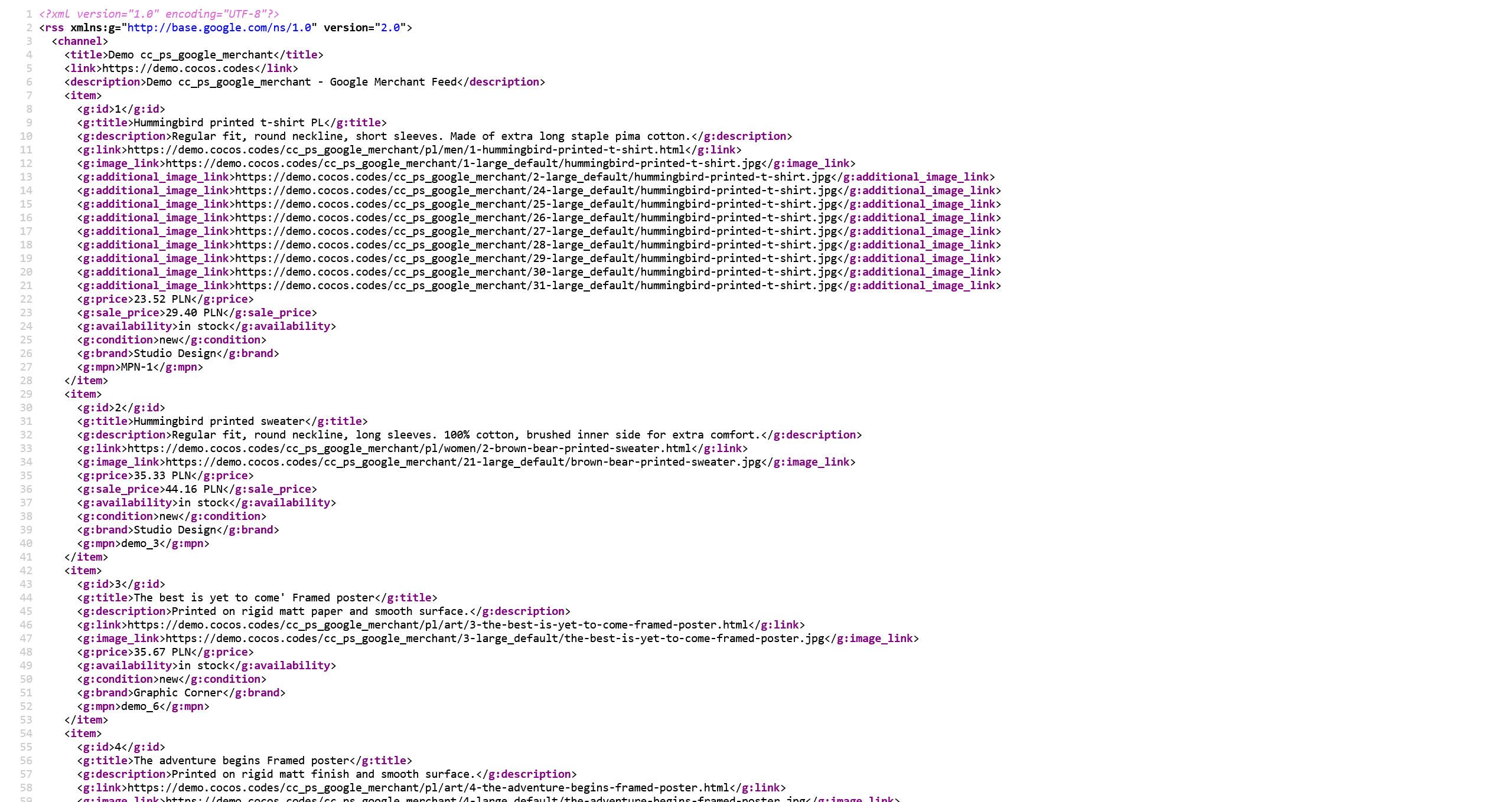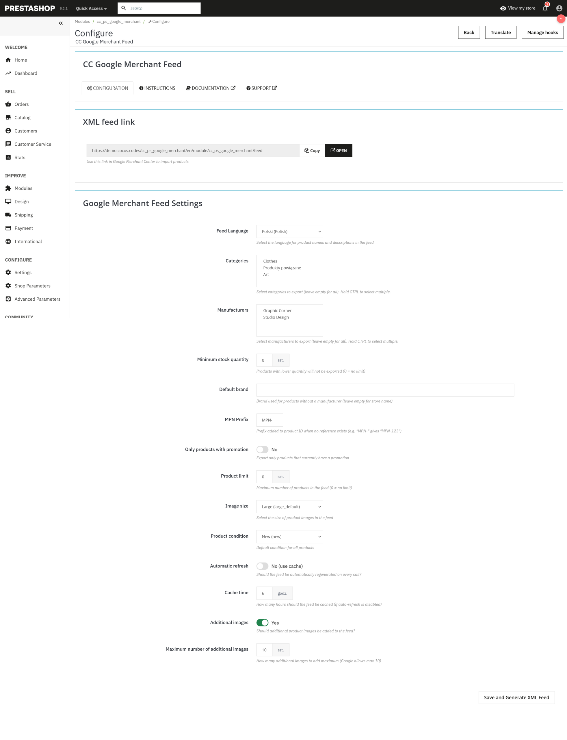 CC Google Merchant Feed est module avancé pour boutiques PrestaShop souhaitant s'intégrer pleinement à Google Merchant Center. Génère automatiquement un flux XML contenant tous les produits de la boutique conformément aux spécifications de Google, avec des options de configuration et de filtrage avancées. Augmentez la visibilité de vos produits sur Google Shopping, améliorez la qualité du flux et fournissez les données les plus récentes à Google Merchant Center. Implémentation professionnelle prête à l'emploi dès l'installation.Génération automatique de flux e-commerce
